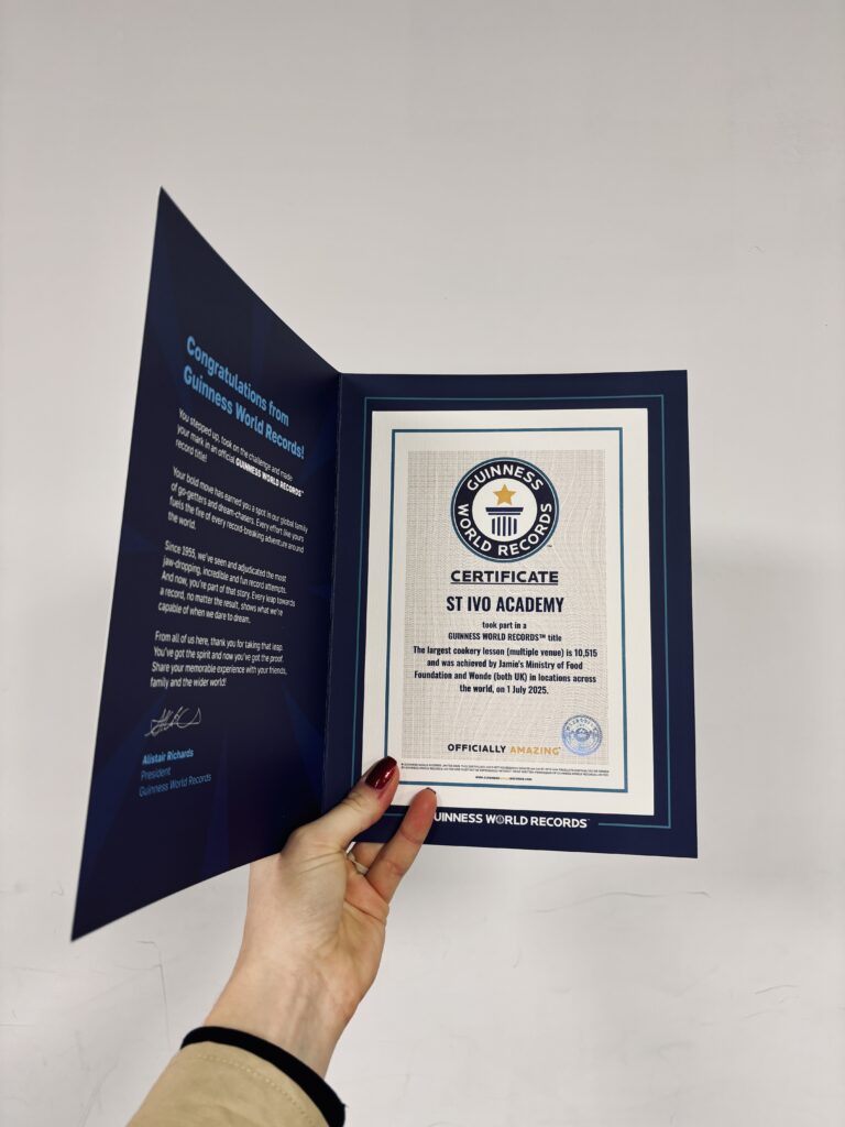 Together, with more than 10,500 other people across the world, the St Ivo students and Jamie Oliver managed to get the Guinness World Record. Our record-breakers cooked up fresh pasta and an easy, no-cook tomato sauce for their feast of champions.